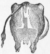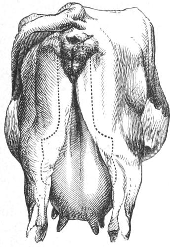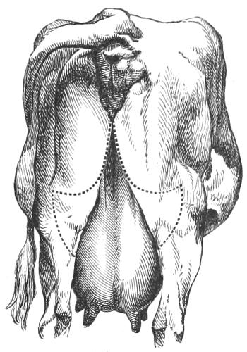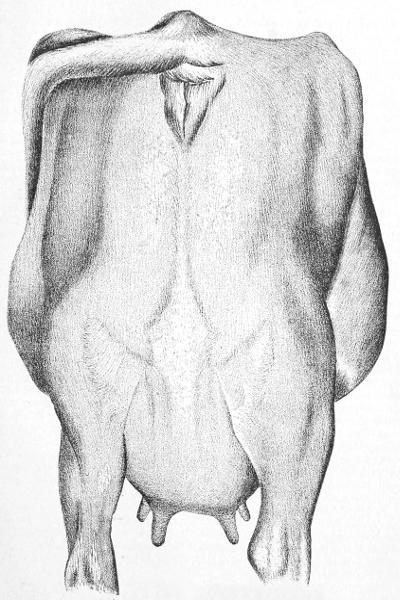 Each of the classes or families is characterized by an escutcheon of fixed form, always similar to itself, while one does not get out of that class or that family, but variable in the dimensions of its surface. That dimension or that surface should be estimated by square centimeters, but that would be too complicated for the practical man; since it depends on the size of the individual, it is estimated by the limits of the escutcheon placed on the hinder part of the animal. The extreme limits are the hams, the interior surface of the legs and vulva. The surface of the escutcheon, of which the extent varies, has permitted me to divide each class or family into six orders, for each one of which I assign, in taking account of the shape, the quantity, the continuation, and the quality of the milk.