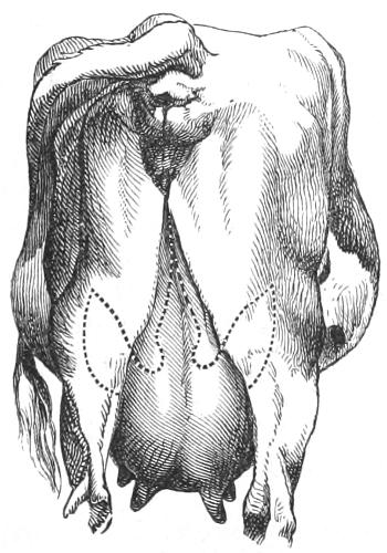 In order to see well the escutcheons with all the fullness which my sketches give them, it must be supposed that the udder of each cow is seen at its greatest plenitude of milk, such as would separate the hind legs to the greatest extent. In this way the escutcheon is seen as if the entire skin of the animal was placed flat, or as if the envelope of the milk bearing apparatus formed a plain surface, on which are drawn the elevations, the depressions, and all that is not visible to the eye, without the aid of hands or of movement of the cow, both that which is hidden at the further side and in the folds of the udder and of the thighs of the animal on foot.