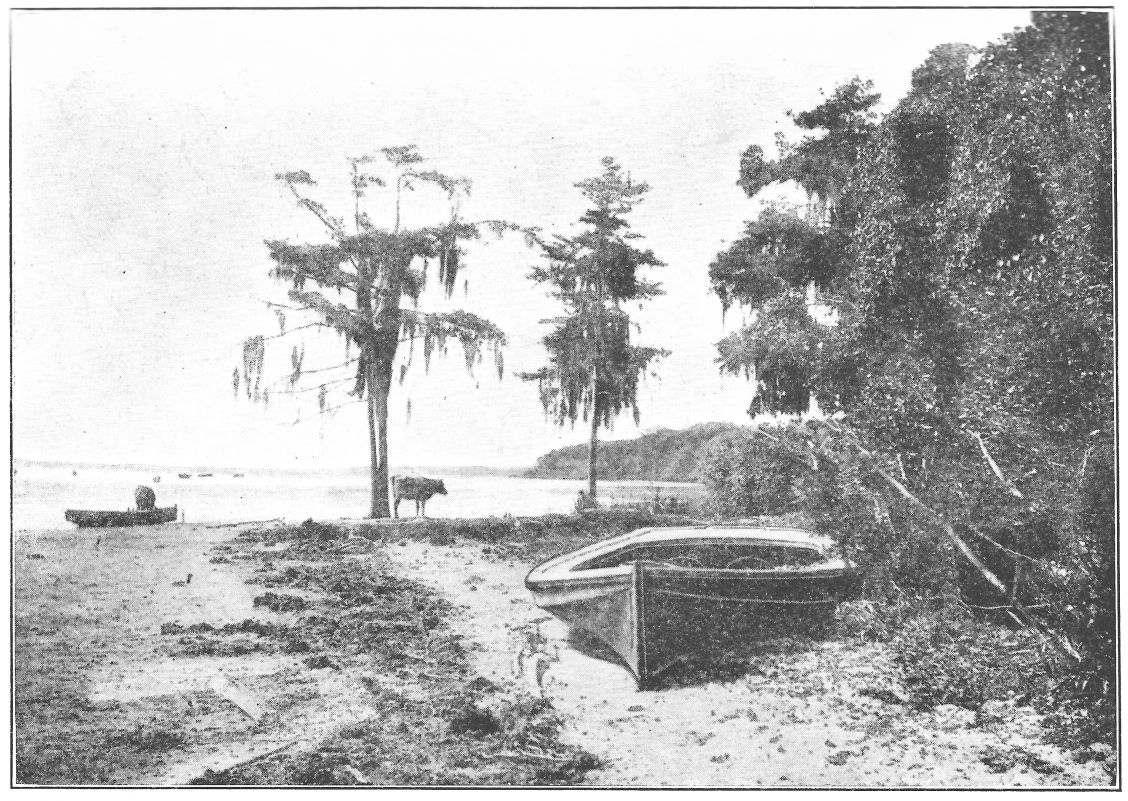 After the mocking bird’s whistle came a second melodious note, the tinkle of passing cow-bells, recalling to mind once more quiet elm-shaded New England streets and rock-walled pasture lanes. Yet in this tinkle was a puzzling note as the cattle passed and the sound faded into the distance, a bubbling change of tone, a liquid drowning altogether new and delightful. I followed its siren call to find myself led, as by the sirens of old, to water. Down the streets of a morning wander the scrub cows of the place, munching live-oak acorns as they pass to their grazing grounds, the shallow waters of the St. Johns. Into this they wade fearlessly, often neck deep and a quarter-mile from the shore, sinking their heads to the bottom to feed on the tender herbage of aquatic plants. The tinkle of the cow-bells catches its bubbling note and its drowning fall in its continual submergence and resurgence. It is as characteristic of a St. Johns River town as the melody of the mocker, different, but perhaps equally delightful in its musical quaintness.{13}