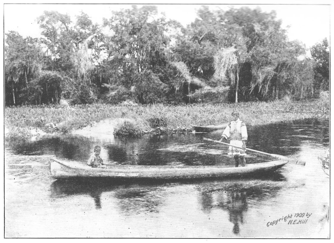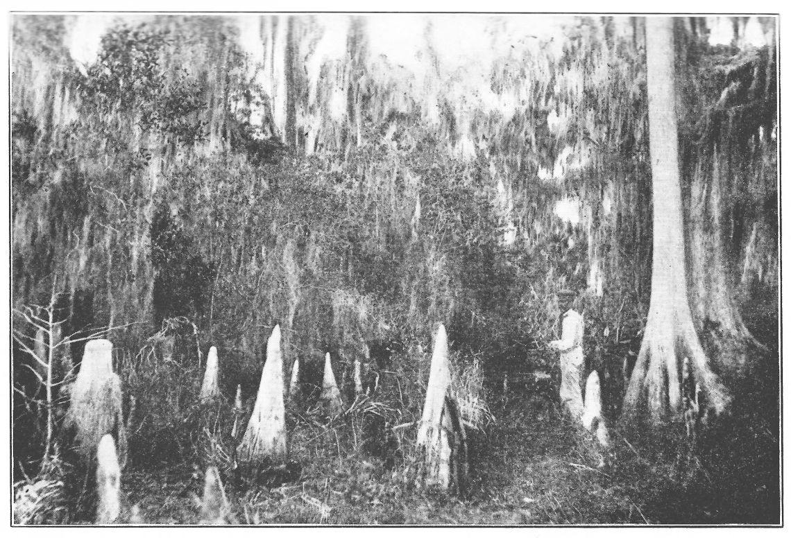 The little river steamer that takes you up the St. Johns from Jacksonville to Orange Park soon leaves the uproar of the city, the skyscrapers and drawbridges, tugs, lighters, and coastwise steamships behind, and puffs onward into placid reaches that to the eye have changed little since the days of De Soto. If plantations and villages exist ashore there is but little indication of them. The banks are lined with verdure, green and gray,—green with the foliage of century-old live-oaks and tall, long-leaved pines, gray with exquisite festoons and dangling draperies of the moss that decorates every tree and fairly smothers some of them. There is a crinkly grace, an elderly virility about it that is most engaging. It takes but little effort of the imagination to see the red cheeks and twinkling eyes of a myriad disciples of Santa Claus peering through it ready to bring gifts to all good children. I have yet to see with what costume they simulate the good saint in this country. If they do not make his beard of this softly beautiful, crinkly, fatherly gray moss I shall feel that they miss an excellent opportunity. Here{10} and there through the moss and among the big, rough tree-trunks a tiny road winds down through the needle-carpeted sand and leads to a slender long pier, built far out over the shallow reaches of the river to a landing for the river boats. The stream is miles wide in its lower course, but only in its channel is it deep. Shallows stretch far from either bank and fleets of water hyacinths voyaging seaward with the current strand sometimes far from shore. The fifteen-mile trip is thus like one into a sub-tropical wilderness untouched by the chill of approaching winter, little marred by the hand of man. The miracles of gorgeous autumn coloring which we left behind in the Massachusetts woods find no echo here. Now and then a sumac leaf shows dull crimson or the wild grape takes on a somber yellow, yet these tiny dots of color are no more to be noticed in a general survey of the forest than the bright hues of the butterflies that swarm at midday in the bright sun and a temperature of eighty in the shade.