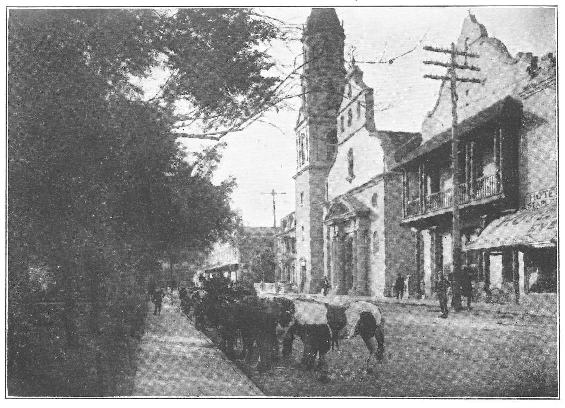 The principal street of the town runs east and west from the boat landing to the railroad station. It is laid out so wide that the wagon tracks rather get lost in it and wander uncertainly from side to side, so wide that it takes three rows of stately, moss-bearded oaks to shade it, two between the broad sidewalks and the street, a third down the middle. There is room for a trolley line each side of this central row and plenty of space for a city’s wagon traffic between that and the sidewalk. The trolley line is not here, however. Only an occasional lazy horse scuffs through the sand. Somebody planned Orange Park for a metropolis, and it may be that yet, but the time has been long in coming.