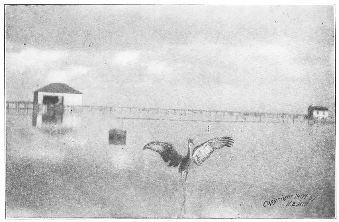 The first Florida land bird that I saw was the buzzard. If the cormorant is the statue of repose, the buzzard is the poet of motion. I suspect that this bird was the original mental scientist. He moves by thought-power alone. I am always reminded, in watching his progress, of the ancient story of the Chinaman watching his first electric car. The buzzard certainly has no visible “pushee” or any observable “pullee.” But how silently and beautifully he goes. Never a flap of the broad black wings and never a quiver of the widespread primary tips. He just thinks himself along, against the wind or with it, up or down. His broad wings are like the prayer rug of the Arabian tale. He adjusts himself upon them, stretches forth his bald red neck and just wishes himself in some place, near or far, and forthwith he sails swiftly to it. In what as yet unexplained principle of progress he finds his power no pres{9}ent-day aeroplanist can say. When he finds out, the flying man of the future may do away with the motor which so frequently fails to mote and the propellers which break in mid-air and spill the passenger. Go to the buzzard, thou Bleriot; consider his ways and be wise.