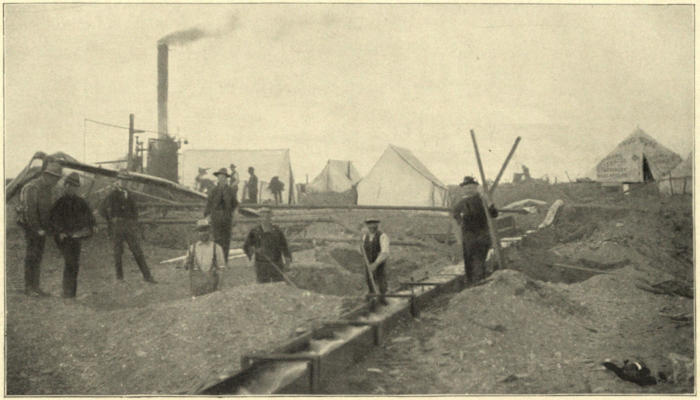 “Colonel,” said he, “these are Mr. Nickerson and Mr. Desmond, discoverers of Candle Creek diggings, the richest in the known world. Boys, this is Colonel Lane, of California, now of Nome. He’s also about the[375] richest in the known world, but, like Julius Cæsar or whoever it was, he’s looking for more mining-fields to conquer. Gentlemen, show Mr. Lane what’s in the riffles.”