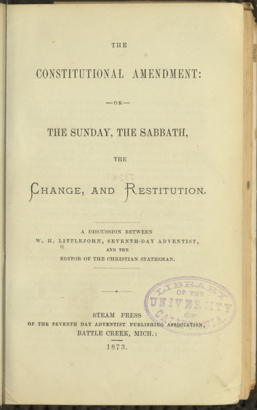 THE CONSTITUTIONAL AMENDMENT: OR, THE SUNDAY, THE SABBATH, THE CHANGE, AND RESTITUTION.