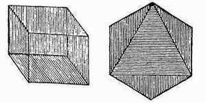 8. Solids.—In solid matter the particles can not be moved about among each other; but each particle generally retains the same position in relation to those particles which are around it—in other words, it does not change its neighborhood. This is more true of some solids than of others. It is absolutely true of such hard solids as granite and the diamond. In these the particles are always in the same relative position. But it is not so with gold or lead. By hammering these you can change greatly the relative position of their particles. India-rubber is a solid, but the relative position of its particles can be much altered in various ways.