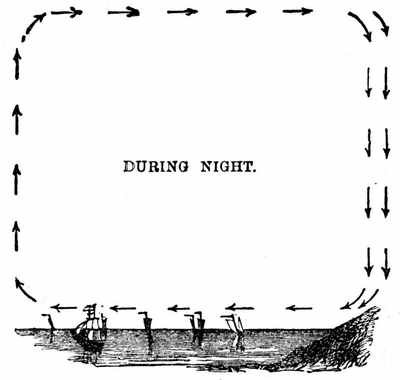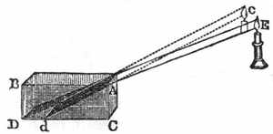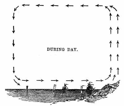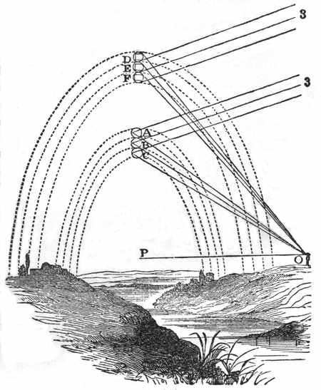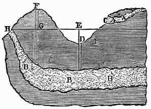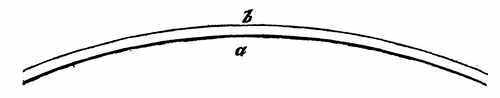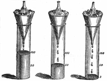 9. Liquids.—It is the grand characteristic of a liquid that its particles change their relative position from the slightest causes. It is in strong contrast with solids in this respect. When you move any portion of a solid body you move all the other portions of it, and generally in the same direction. But a body of liquid can not be moved all together as one body except by confining it; as, for example, in the case of a water-pipe or a syringe. And then, the moment that the water can escape, the particles use their liberty of altering their relative position. As wind and other agents act continually upon water, no particle stays for any length of time in the neighborhood of the same particles. "Unstable as water" is, then, an exceedingly significant expression. Water is never at rest. A particle of it may at one time be floating on the surface of the ocean, and at another be[16] in depths beyond the sounding of man. It flies on the wings of the wind, falls in the rain, runs in the stream, is exhaled from a leaf, trembles in the dew-drop, flows in the blood of an animal or in the sap of a plant, and is always ready to be jostled along in its ever-changing course.