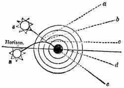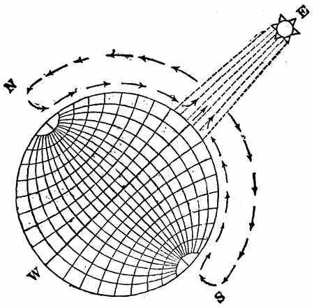 10. Gases.—The particles of gaseous or aeriform substances move among each other even more freely than those of a liquid. Air, therefore, is more unstable and restless than water. Even when the air seems to be perfectly still its particles are moving about among each other. You can see this to be true if you darken a room, leaving a single shutter a little open. Where the light enters you will see motes flying about in every direction, which would not be the case if the air were really at rest. The particles of air have a greater range of travel than those of water; for the sea of atmosphere which envelops the earth rises to the height of about fifty miles. How far water rises in its evaporation we know not; but it is not at all probable that it rises to the uppermost regions of the atmosphere.