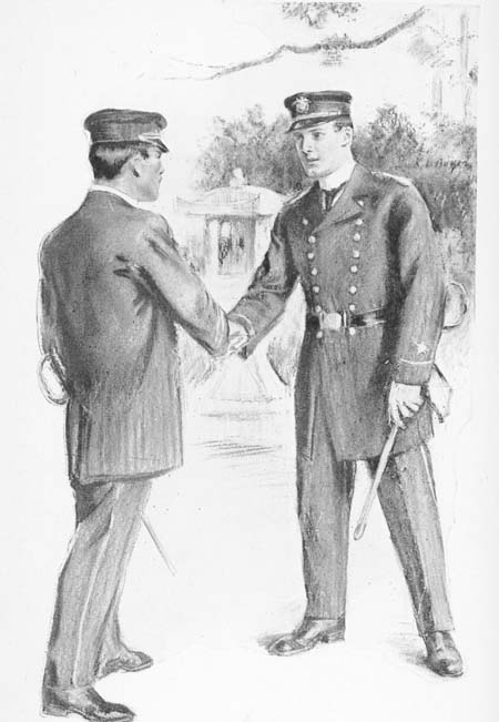He could pretend to enter their compartment by mistake, and impress their faces indelibly upon his memory, to be used at some future time. With this object in view Phil placed his hand on the door-knob trying to turn it, only to find the latch had fallen from within. Frustrated, he stood thinking excitedly as to what his next move should be. The door of his own compartment suddenly opened and Sydney Monroe, his companion and classmate at the Naval Academy at Annapolis, gazed in surprise at the stern set face of his friend.