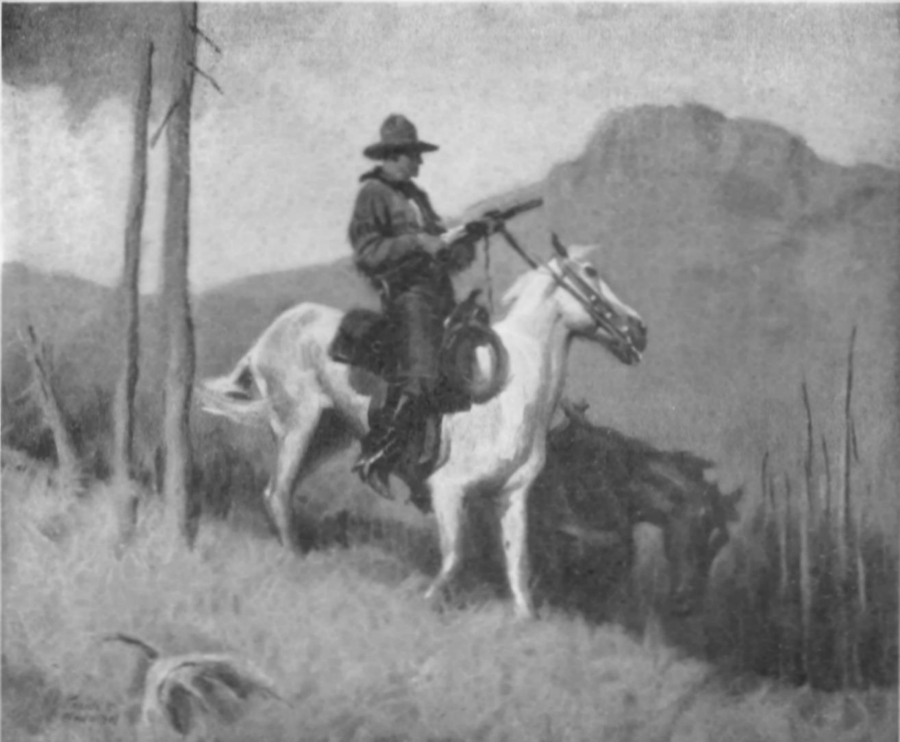 Columbine saw a white mustang flash out on top of the ridge, silhouetted against the blue, with mane and tail flying. His gait on that edge of steep slope proved his rider to be a reckless cowboy for whom no heights or depths had terrors. She would have recognized him from the way he rode, if she had not known the slim, erect figure. The cowboy saw her instantly. He pulled the mustang, about to plunge down the slope, and lifted him, rearing and wheeling. Then Columbine waved her hand. The cowboy spurred his horse along the crest of the ridge, disappeared behind the grove of aspens, and came in sight again around to the right, where on the grassy bench he slowed to a walk in descent to the bluff.